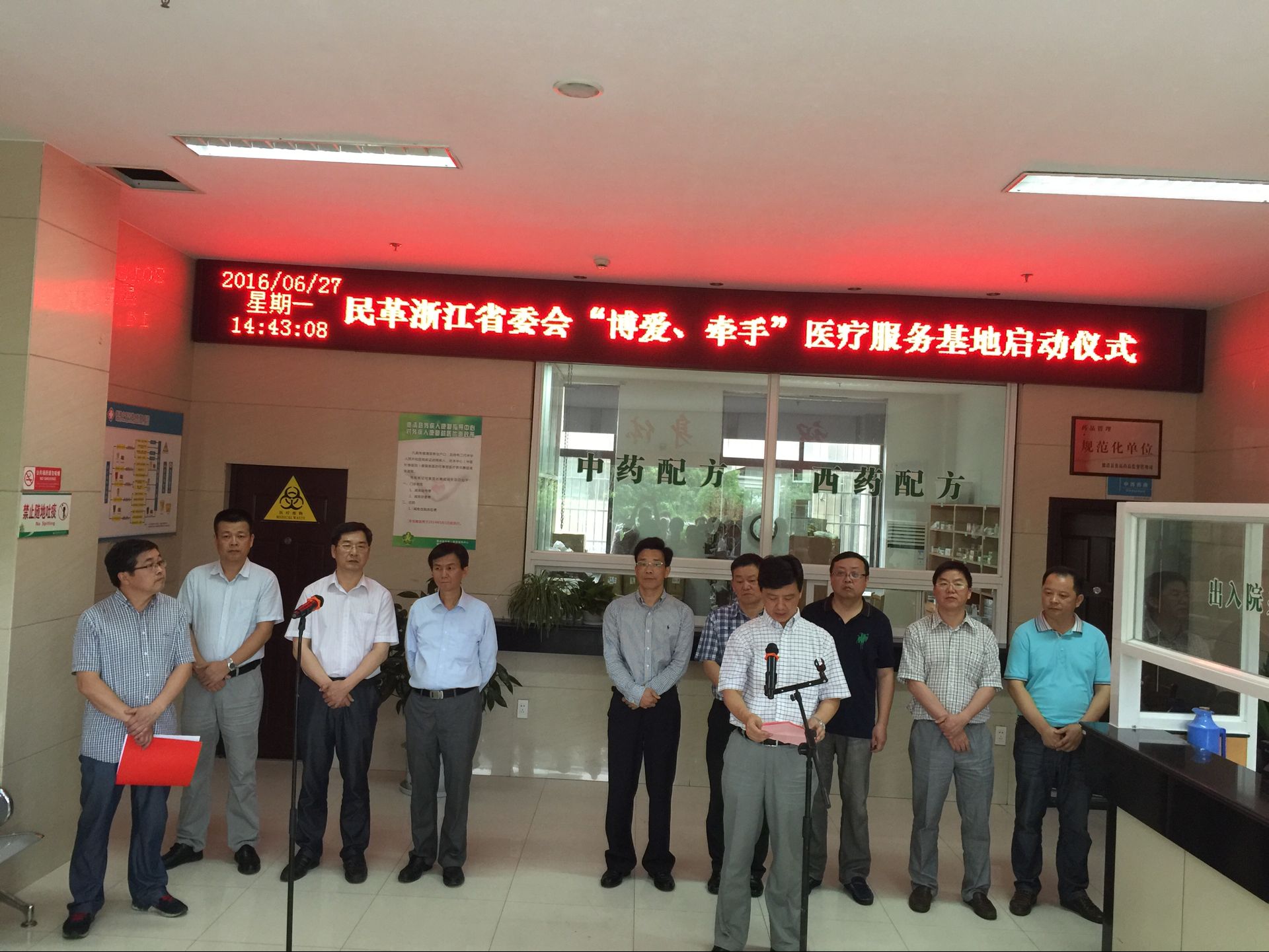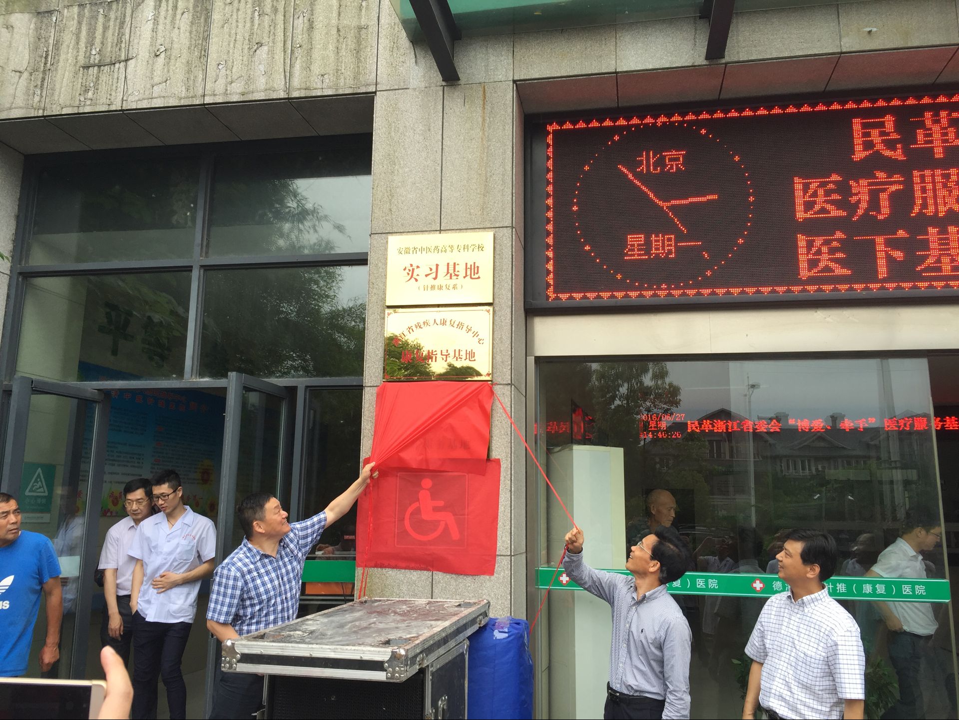 2016年6月27日下午,由民革浙江省委会副主委王建康、社会服务处副处长余德平、民革湖州市委会副主委周少翌、德清县委常委统战部长杨明连、民革德清县委会沈建忠主委等领导,参加民革浙江省委会“搏爱、牵手”医疗服务基地揭牌仪式。来自省、市、县民革各医疗专业的知名专家参加了揭牌仪式。然后,参加仪式的领导视察了德清中医针推医院的医疗服务环境、科室设置及医疗设施。医疗服务专家在武康街道春晖社区开展医疗咨询和义诊服务。