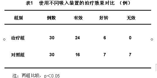 本文数据结果表明,治疗组疗效明显优于对照组(P<0.05)。目前哮喘的治疗中,气雾剂吸入疗法也是主要的治疗方法,但儿童因年龄小,理解能力差,手控与呼吸不协调,直接影响治疗效果。定量雾化剂(普米克令舒、可必特)+ 宁音20ml-II型药物雾化器氧气驱动雾化,小儿戴面罩下通过自然呼吸,反复从雾化器中吸入药物,解决了喷药与吸气难协调的问题。其操作简单,携带方便,安全可靠,值得推广。